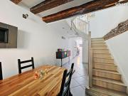 ...salon et cuisine dans un même espace. Poutres apparentes, pierres au mur, lumière douce. On sy sent bien. Lambiance est douce, la chaleur vient dune pompe à chaleur. Létiquette D du DPE en dit assez. Il y a quatre chambres. Deux étages. Chacun son co...