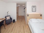 ...22,6m² idéal pour les étudiants. Il comprend une pièce de vie (lit, bureau, meubles de rangement), un coin cuisine entièrement aménagée et équipée (réfrigérateur, plaques électriques, micro-ondes, rangements et vaisselle) et une salle deau avec WC. F...