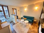 ...T1 bis MEUBLE de 20,89m2 comprenant une pièce de vie avec cheminée décorative et placards, un canapé et une table, une cuisine aménagée et équipée (plaques, hotte, four, évier, frigo, vaisselle), une chambre sur cour avec literie et salle de bain ave...